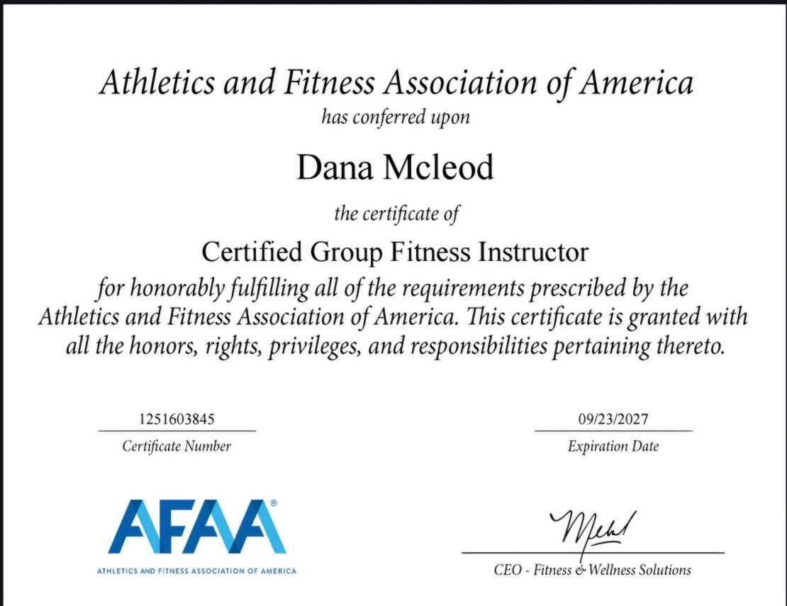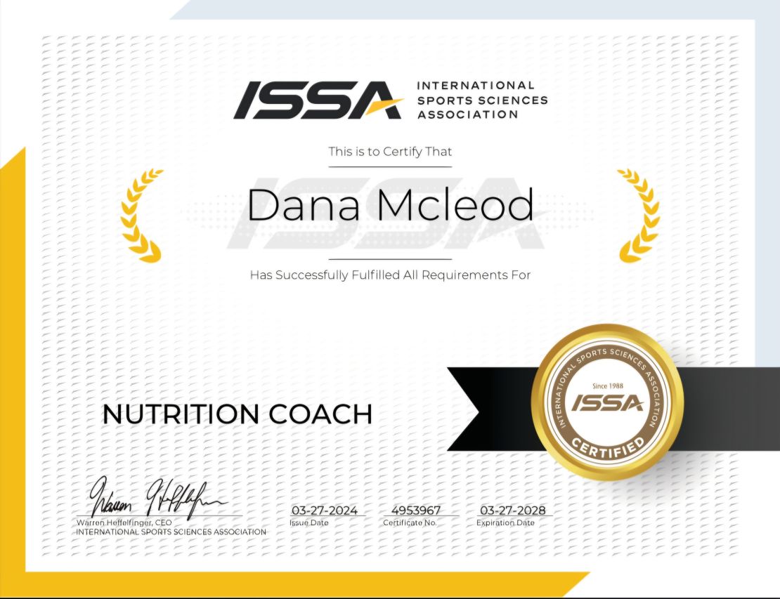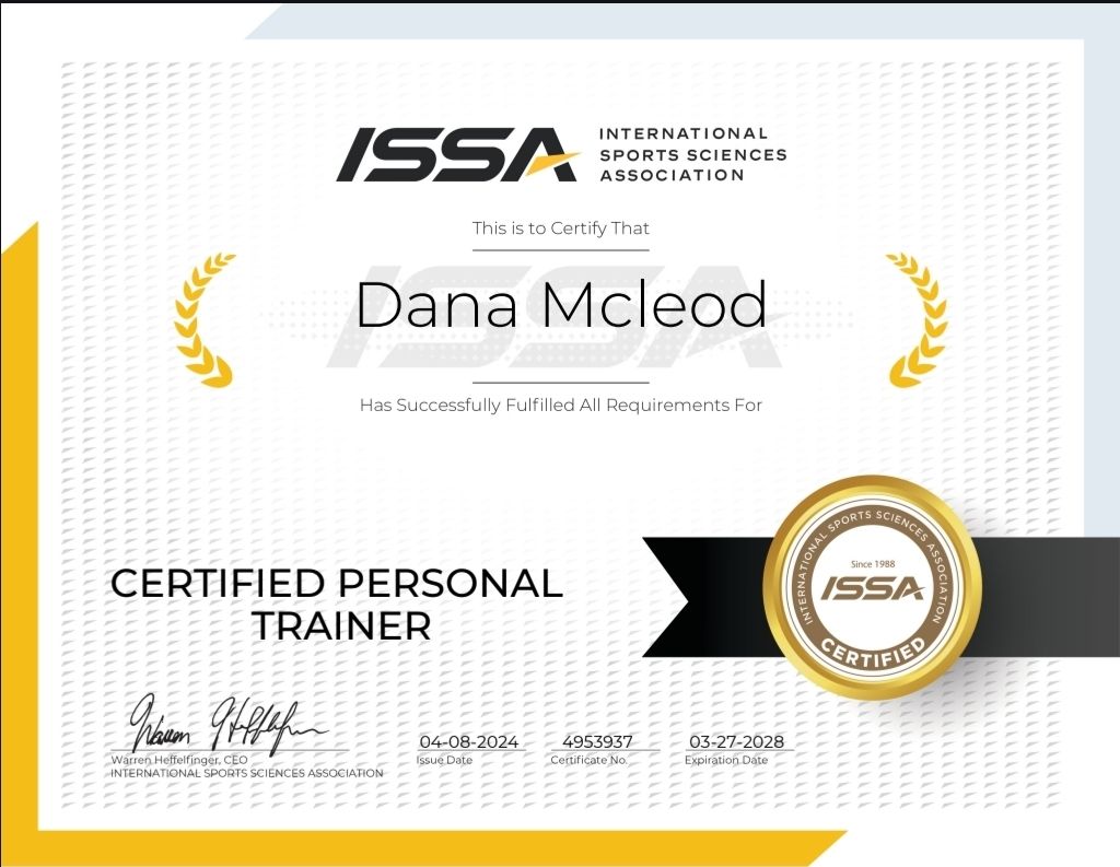 ISSA Certified Personal Trainer, Nutrition Coach, AFAA Certified Group Fitness Instructor